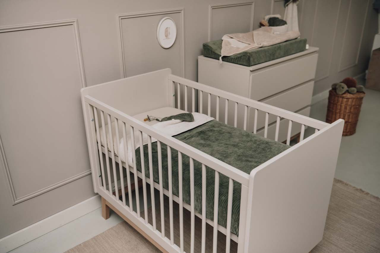 - Tijdloze ribfluweeltextuur en kleuren die prachtig passen bij een moderne babykamer.